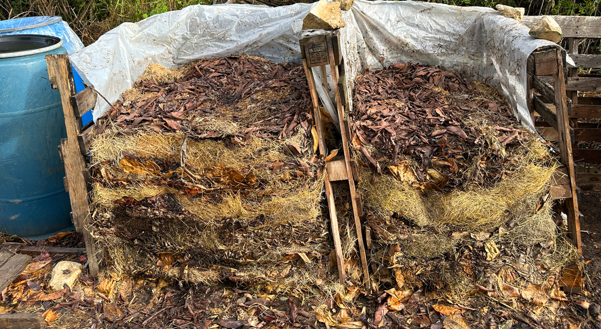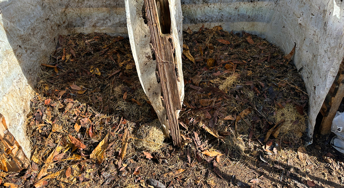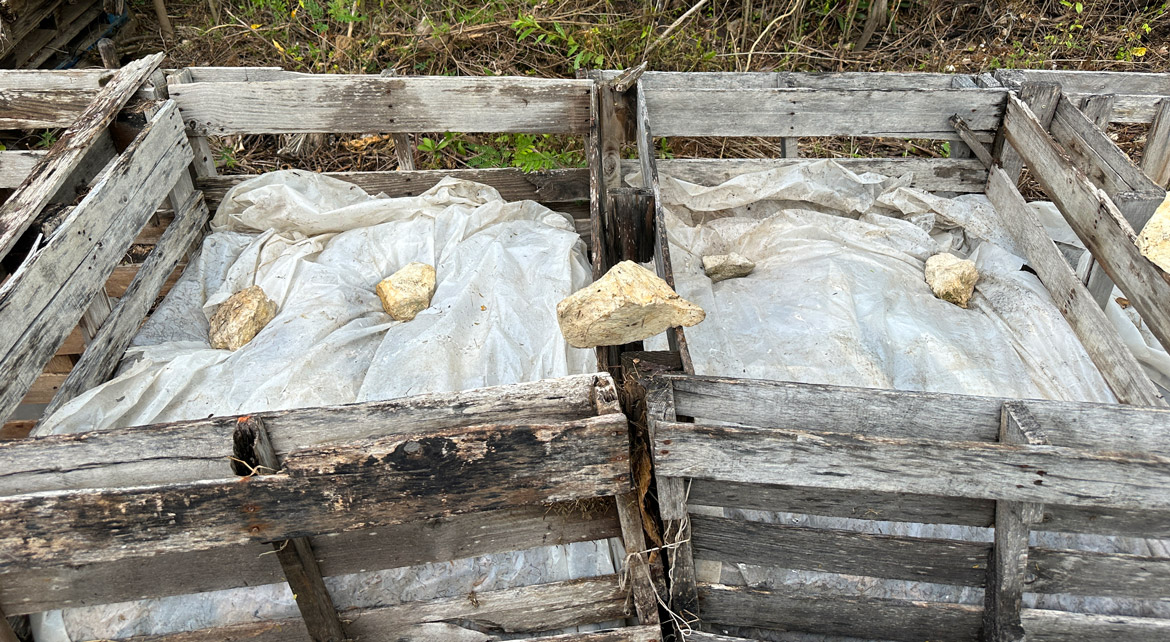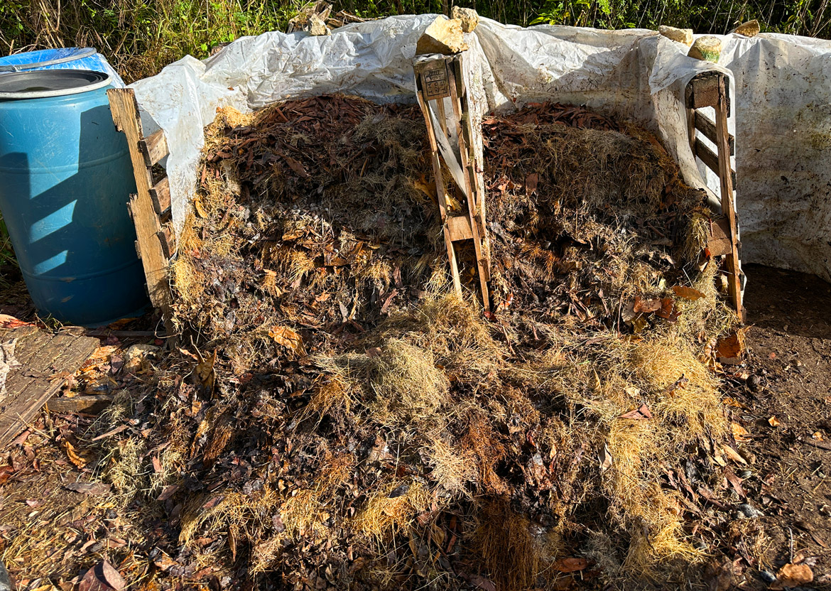 Once all the material is mixed, moistened and moved to the new bays, we wet it down one final time, cover it over with the plastic, and place a couple rocks on top to compress and hold everything in place. Now it’s back to our monitoring regimen, until it’s time to turn the batch again in about 10 days or so.